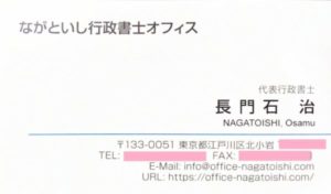 | ・事務所名決定 | 正式名称は「長門石行政書士オフィス」だが、「長門石」だと苗字だと分かりにくく、少し堅苦しい印象があるため、息子の意見を採用し、ひらがな表記の「ながといし行政書士オフィス」にした。 行政書士という資格・職業は海外(少なくともアメリカ)には存在しないため、完全に対応する英語表現はない。しかし、辞書では Administrative Scrivener と訳されているため、正式な登録事項ではないものの、英語表記は NAGATOISHI Administrative Scrivener Services とした。 | ||