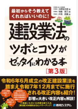 | 25年6月1日 | 建設業法のツボとコツがゼッタイにわかる本 | 官公署への許認可申請書類の作成・提出代理 | 行政書士法人名南経営 | 業務知識の習得 | ・前提知識 ・建設工事 ・建設工事の請負契約 ・技術者 ・施工体制台帳・施工体系図 ・経営事項審査(経審) ・監督処分と罰則 | ![]() | 書籍 | 図書館貸出 |